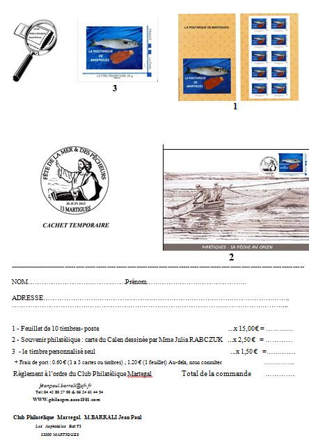 Le Club philatélique Martegal s’associe à cet évènement et organisera le 30juin & le 1er juillet un bureau postal temporaire et une exposition sur la mer, nous avons tenus à ce que le patrimoine de la Pêche au Calen et de la fabrication de la Poutargue soit mise à l’honneur.